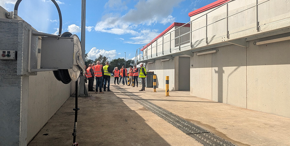 Les eaux usées sont récupérées dans le caniveau central de l’aire de lavage. Un dégrilleur retient les déchets >5mm. Les eaux sont ensuite redirigées vers un débourbeur enterré de 20m3 où a lieu une première décantation. Ces eaux sont ensuite pompées vers un second dégrilleur où sont retenues les particules >2mm puis redirigées vers un séparateur d’hydrocarbures qui assure un niveau d’hydrocarbures inférieur à 5mg/L (conformément à la norme EN858-1).
