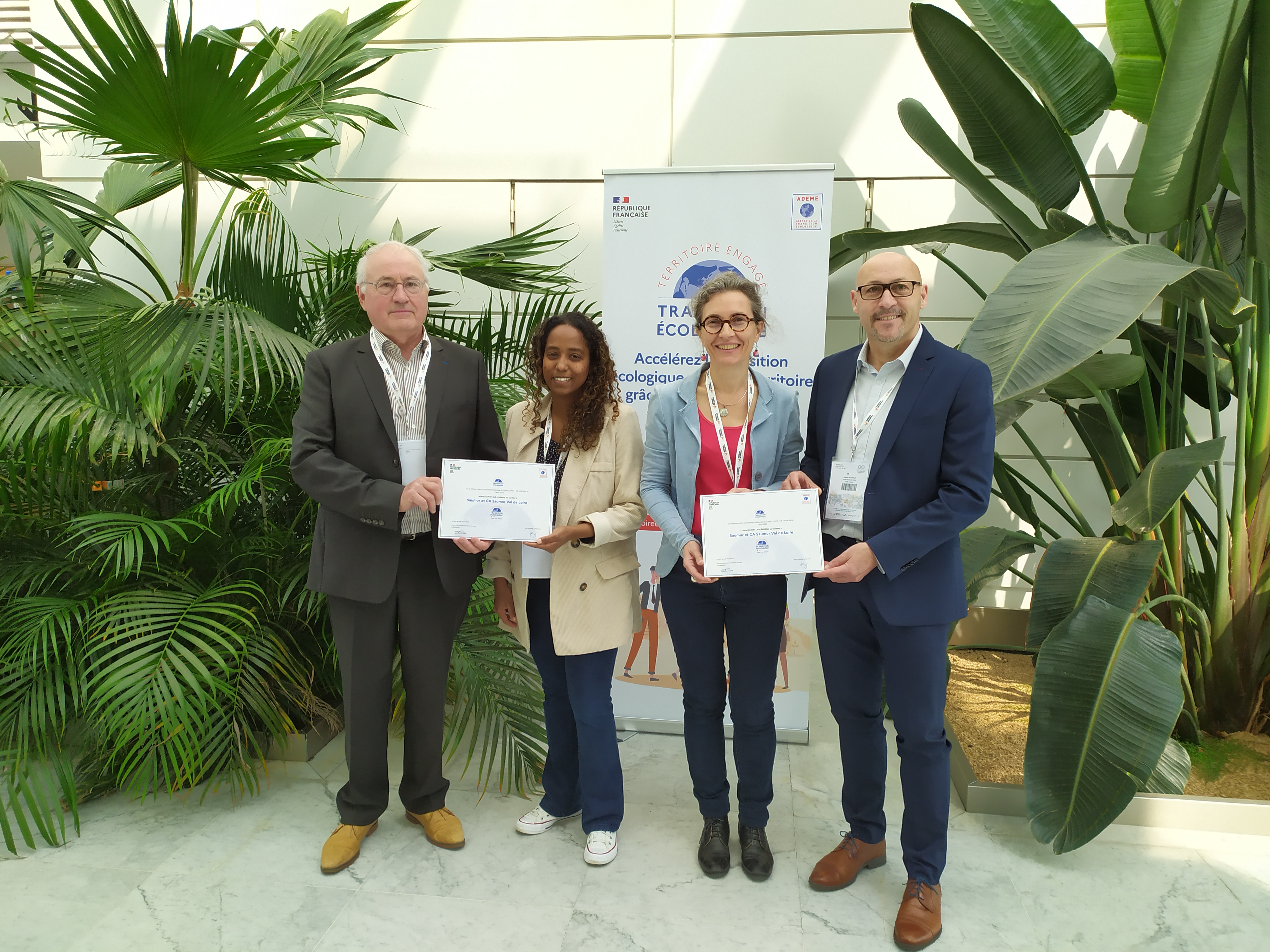 Témoignage de leur engagement et de leur progression en faveur de la transition écologique sur leur territoire, la Ville de Saumur, représentée par Loïc Bidault, conseiller municipal délégué à l'écologie, au développement durable et à la transition énergétique, et l'Agglomération Saumur Val de Loire, représentée par son vice-président Anatole Micheaud, en charge de l'environnement, de la transition énergétique et des mobilités, se sont vues décerner une 2è étoile du label Territoire Engagé Transition Ecologique.