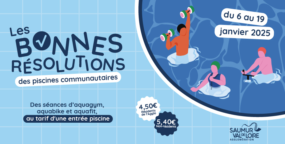 Pour bien commencer l’année 2025 et donner vie à vos bonnes résolutions, l’Agglomération Saumur Val de Loire invite les habitants à découvrir les bienfaits des activités aquatiques à l’occasion de l’opération "Les Bonnes Résolutions". Cette initiative se déroulera du lundi 6 au dimanche 19 janvier dans les piscines communautaires du Val de Thouet et d'Offard à Saumur, Philippe Rivain à Longué-Jumelles et Les Fontaines à Doué-en-Anjou.