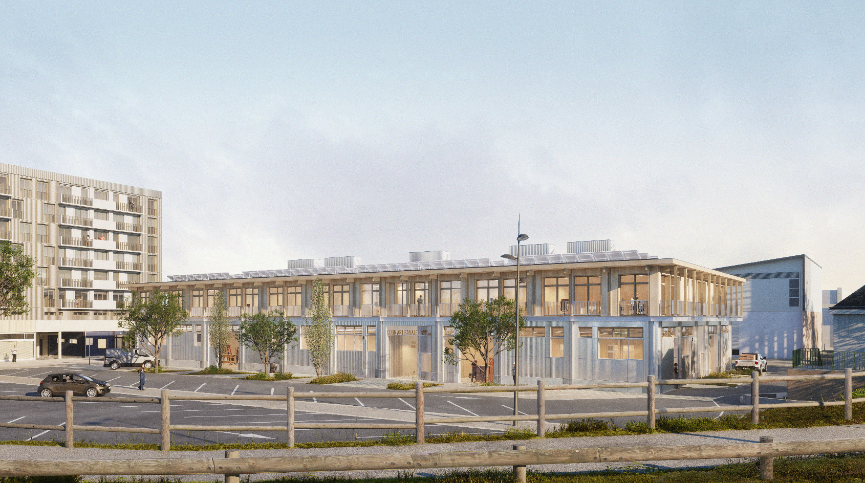 Sur une emprise d’environ 1 300 m², sur deux niveaux soit environ 2 300m² de surface de plancher, la cour artisanale sera composée aux rez-de-chaussée de cellules artisanales de 55 à 220 m². A l’étage, une partie accueillera des bureaux aménagés et une autre sera livrée sous forme de plateau tertiaire pour un aménagement futur sur une surface d’environ 600 m². Dans un contexte de zéro artificialisation nette (ZAN), la structure du bâtiment sera dimensionnée afin de permettre une éventuelle surélévation du bâtiment et ainsi lui offrir un second étage.