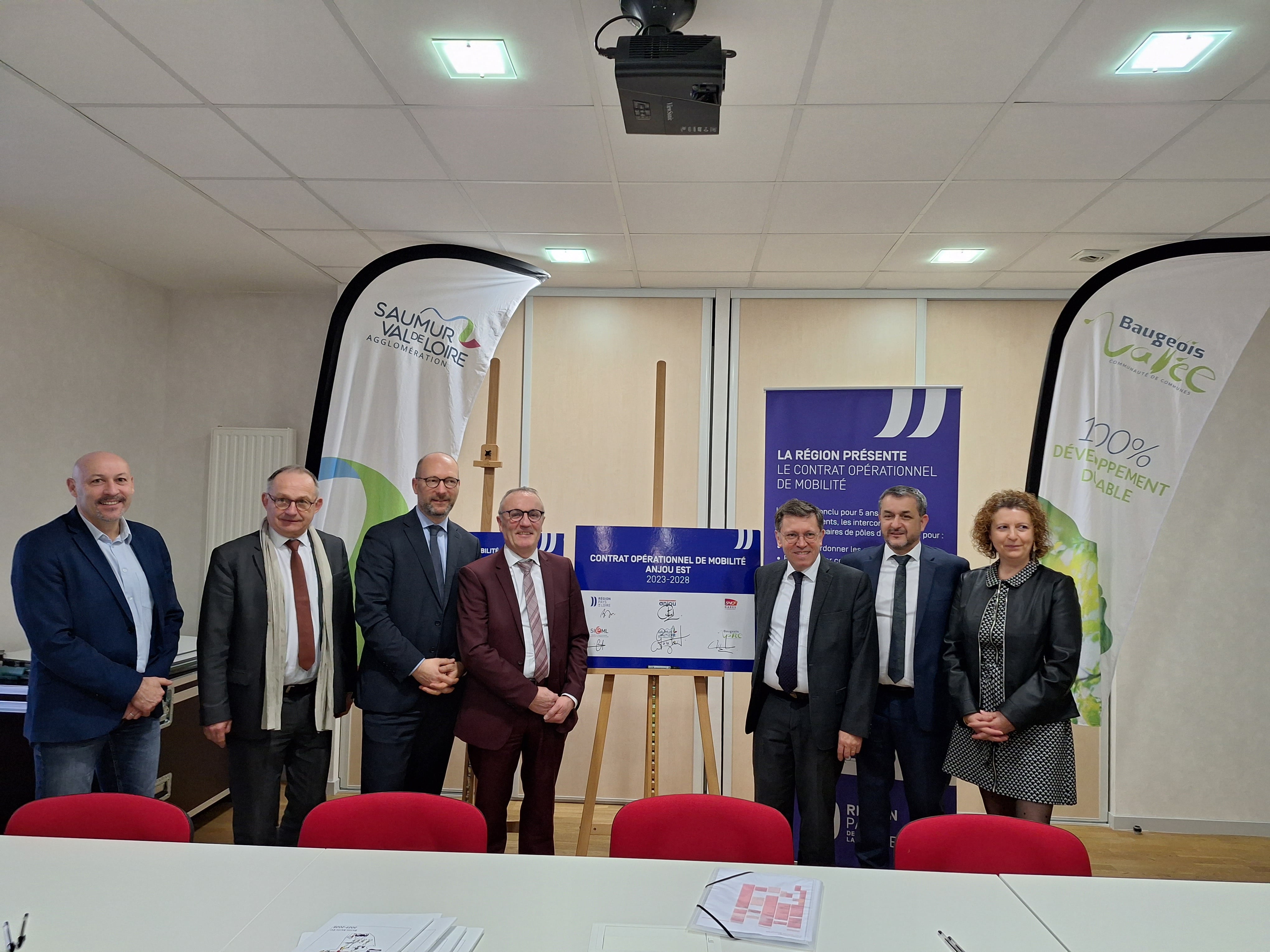 Ce jeudi 22 février, 5 signataires s'engagent auprès de la Région Pays de la Loire autour du contrat opérationnel de mobilité (COM) : le Département du Maine-et-Loire, le SIéML, Gare SNCF et Connexions, la Communauté d'Agglomération Saumur Val de Loire et le Communauté de Communes Baugeois Vallée.