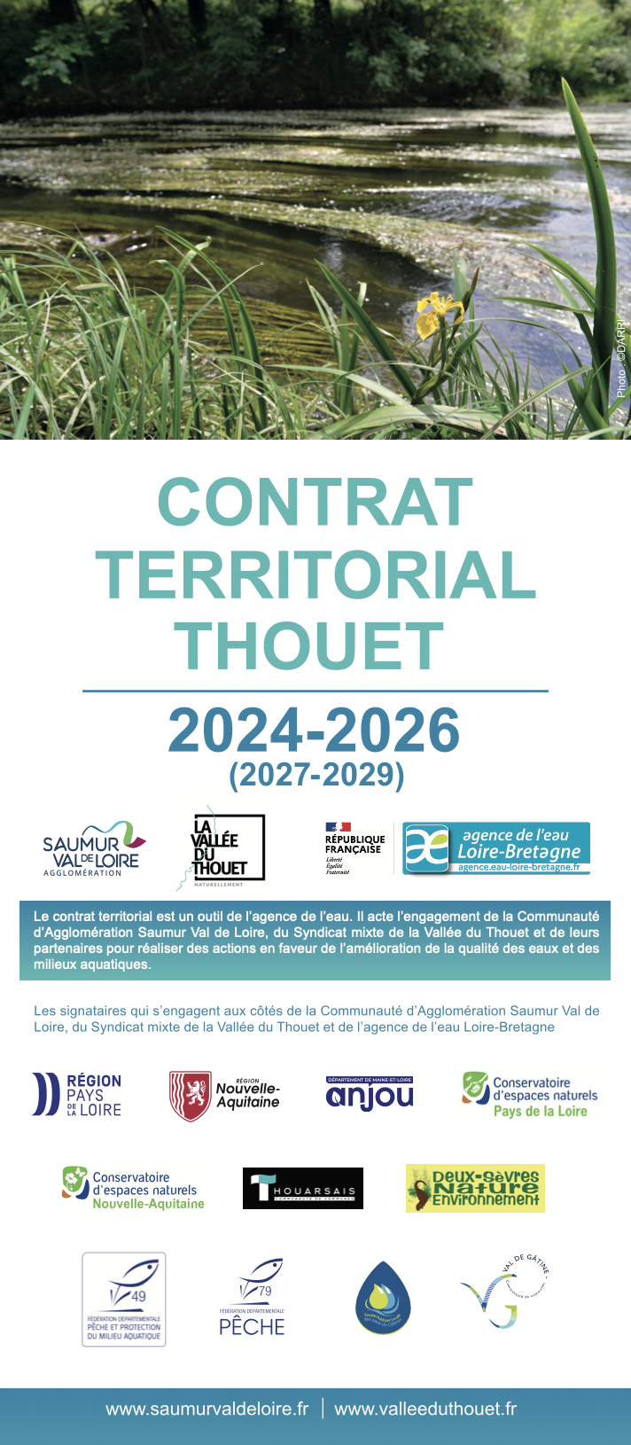 Ce contrat, préparé entre la Communauté d’Agglomération Saumur Val de Loire, le Syndicat Mixte de la Vallée du Thouet, les Régions Nouvelle Aquitaine et Pays de la Loire, le Département de Maine-et-Loire et l’Agence de l’Eau Loire-Bretagne, associe les Fédérations de pêche et de protection des Milieux Aquatiques de Maine-et-Loire et des Deux-Sèvres, les conservatoires des espaces naturels des Pays de la Loire et de Nouvelle-Aquitaine, Deux-Sèvres Nature Environnement, les Communautés de Communes Val de Gâtine et du Thouarsais et la Société Publique Locale des Eaux du Cébron.