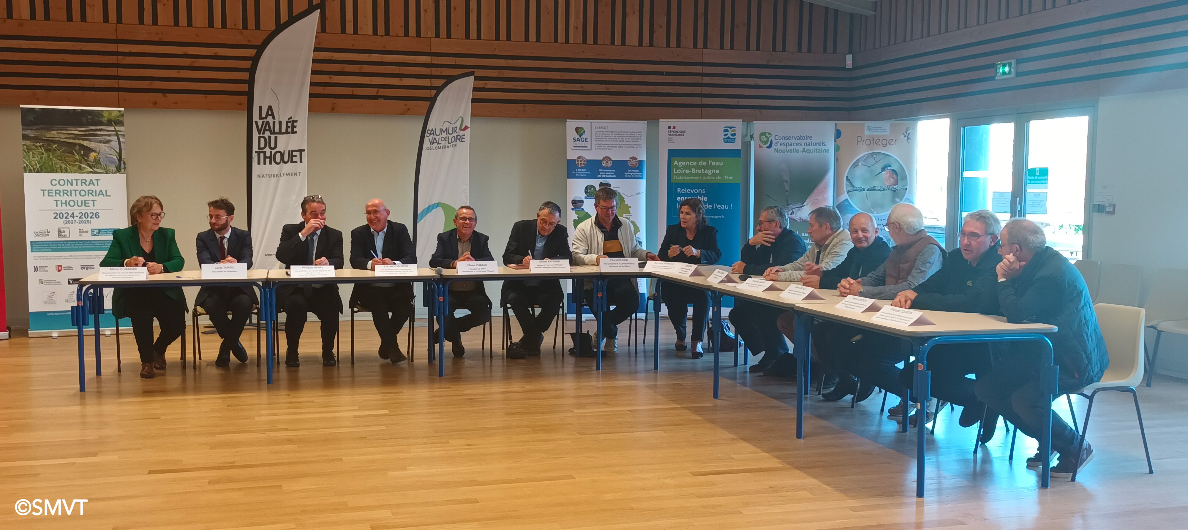 Ce mercredi 23 octobre 2024, la Communauté d’Agglomération Saumur Val de Loire, représentée par Éric Mousserion, Vice-Président en charge de la GEMAPI, le Syndicat Mixte de la Vallée du Thouet, représenté par son Président Olivier Cubaud, et leurs partenaires, ont signé, pour la période 2024-2026, un Contrat Territorial Thouet avec l’Agence de l’Eau Loire-Bretagne représentée par le Directeur de la délégation Poitou-Limousin, Olivier Raynard.