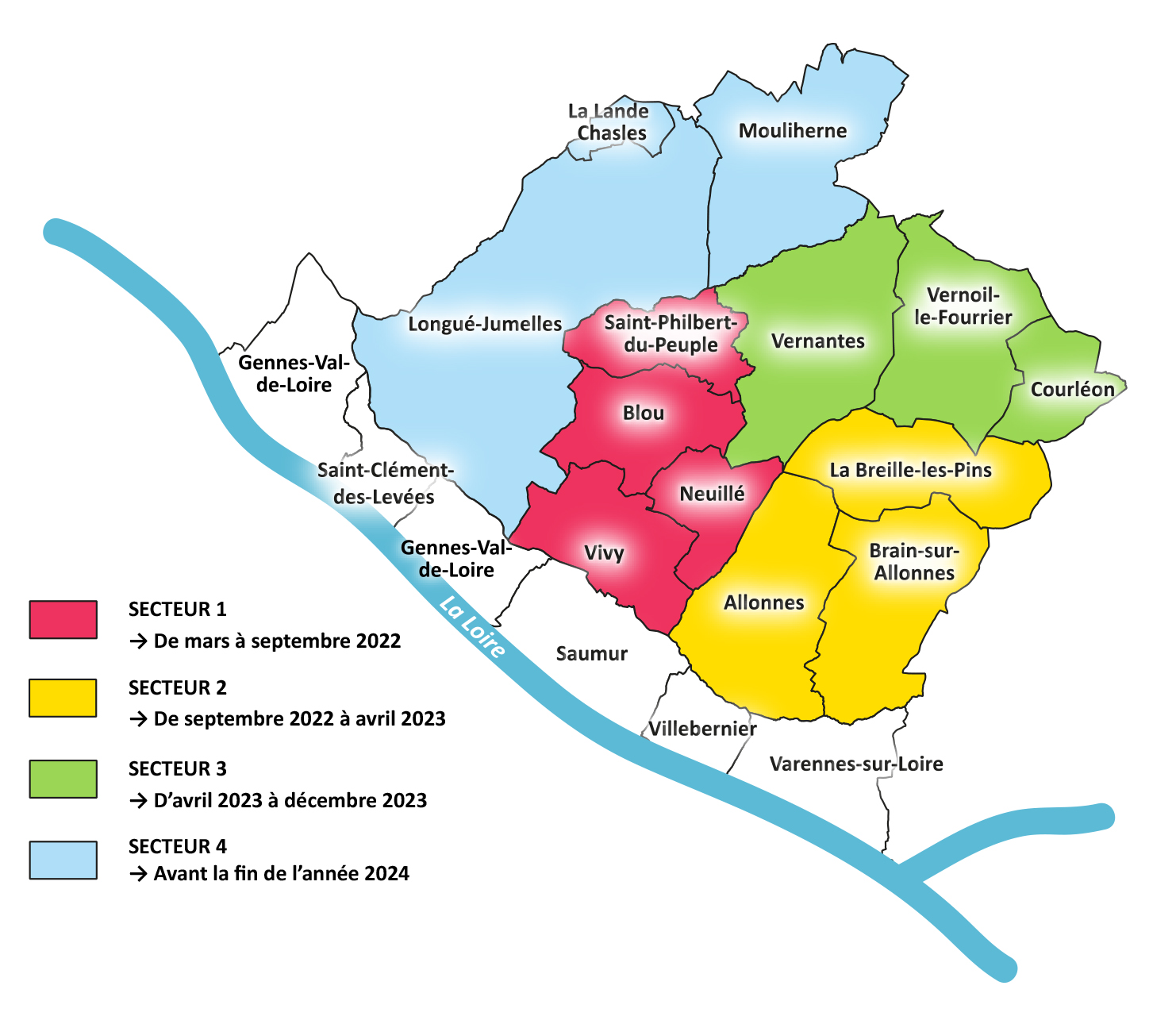 Le déploiement de la télérelève sur les 13 communes couvertes par la Régie Eaux Saumur Val de Loire se fera de fin mars 2022 à décembre 2024 selon le planning suivant :