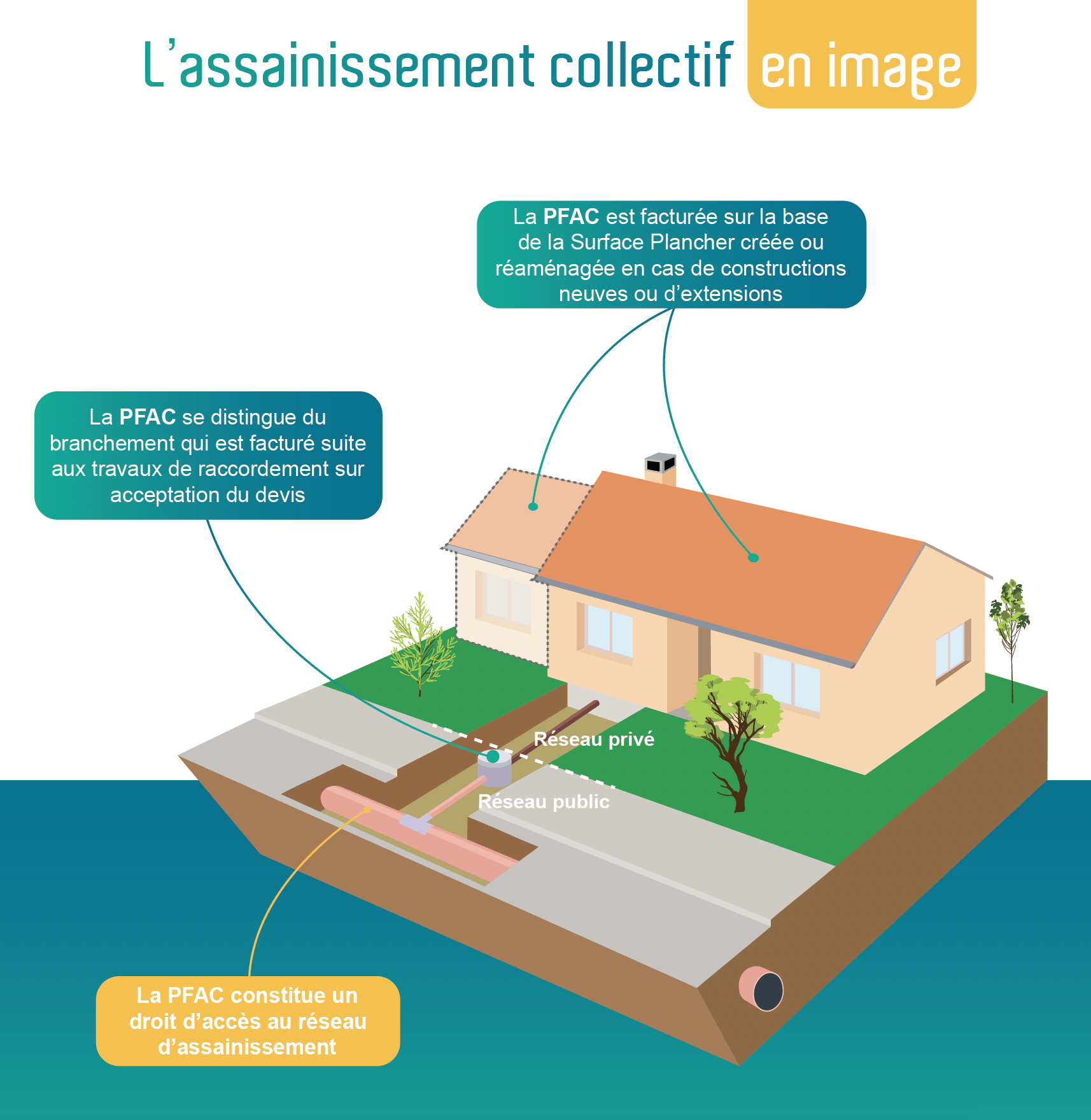La Participation au Financement de l'Assainissement Collectif (PFAC) constitue un droit d’accès au réseau d’assainissement collectif grâce auquel vous bénéficiez de l’assainissement collectif. Elle contribue à financer les grands projets en matière d’assainissement collectif, telle que la construction ou la rénovation des réseaux de collecte des eaux usées et des stations d’épuration. Elle est perçue auprès de tous les propriétaires d’habitation individuelle, d’immeuble avec ou sans activité économique, soumis à l’obligation de raccordement au réseau public d’assainissement visée à l’article L.1331-1 du Code de la santé publique :